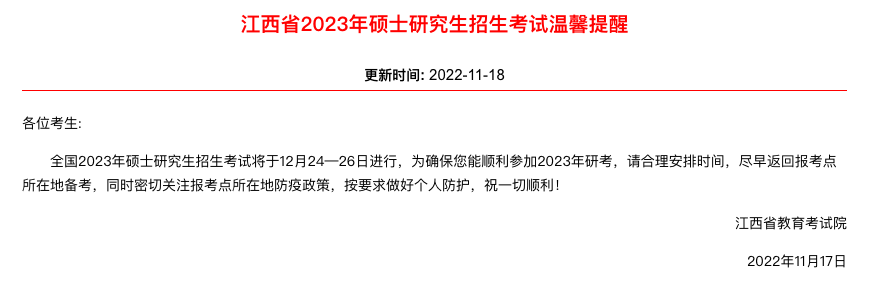 為確保您能順利參加2023年研考,請(qǐng)合理安排時(shí)間,盡早返回報(bào)考點(diǎn)所在地備考,同時(shí)密切關(guān)注報(bào)考點(diǎn)所在地防疫政策,按要求做好個(gè)人防護(hù)。